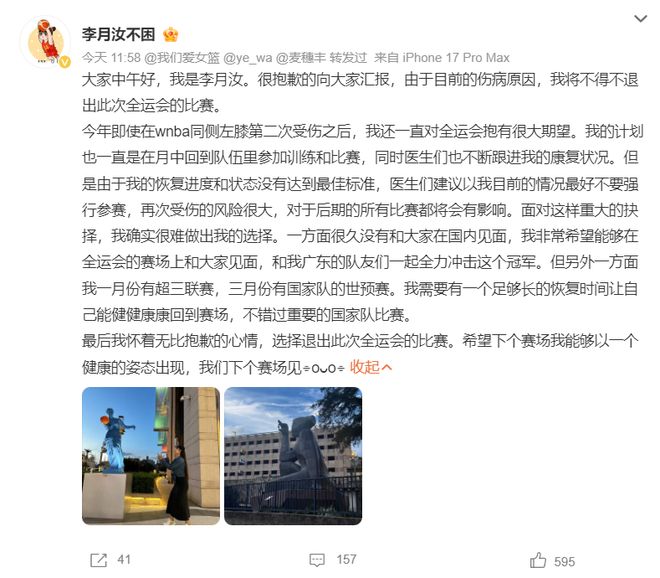 北京时间10月20日中午,WNBA球员李月汝在个人社交媒体上宣布,她将退出11月9日举行的大湾区全运会。 李月汝:很抱歉通知大家,我因伤不得不退出全运会。今年我在WNBA中第二次左膝受伤。尽管如此,我对参加全运会始终抱有很高的期望。我的计划是在月中旬回到球队参加训练和比赛,但我的恢复情况并没有达到预期。医生建议我最好不要勉强比赛,否则再次受伤的风险很大,会对后续的所有比赛产生影响。李月汝还在3月份的国家队世界杯预赛中宣布,她将在1月份参加中超三级联赛(由WNBA球员组建的新联赛)。我需要足够长的恢复时间才能完全恢复并返回游戏,并且不会错过导入蚂蚁国家队比赛。李月如实际上是在10月16日回国的,他参加了一个艺术展的开幕式。这时,他左膝上的护具终于被拆除了。这是他自10月5日以来首次公开露面。10月5日,李月汝的左膝还穿着护具。从8月16日到10月16日,正好是8周,这与医学专家对李月汝左膝的判断相符。不过,这只是膝伤的恢复计划,并不是球场上打球的标准。失去李月汝后,广东全运男篮由七大阵容变为六大阵容:杨利伟、黄思静、杨淑玉、迪加、吴桐桐、陈明令。这五人都是现任/前任中国女足国家队队员。郑薇是广东全运会女篮主教练。李月汝可能是国内唯一能与四川女篮抗衡的内线球员球中锋韩旭。当李月汝停止打球时,广东男篮申办本场比赛的全国冠军肯定就避免了。四川女篮还拥有多名国手:李梦、王思雨、田媛媛、韩旭、高颂、贾赛奇等。