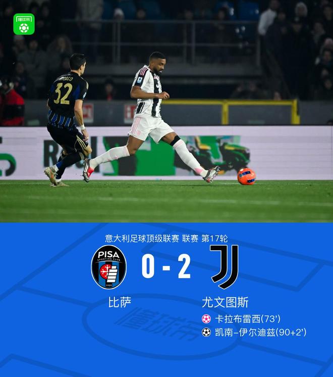 北京时间12月28日,意大利顶级足球联赛第17轮比赛,比萨主场迎战尤文图斯。比萨·卡拉布雷西打进乌龙球。尤文图斯凯南耶尔迪兹进球。最终比萨0-2尤文图斯。主赛事第74分钟,僵局被打破。卡卢卢自摆乌龙。尤文图斯1-0。第90分钟和第2分钟,锁定胜局。耶尔迪兹空门得分。尤文图斯2-0。双方球员为这精彩的时刻鼓掌叫好。比赛即将开始。第15分钟,麦肯尼小角度射门,皮球第一时间击中边网。第9分钟,图拉姆射门被挡出,随后耶尔迪兹射门击中横梁。第24分钟,库普梅纳斯突入禁区射门,被后卫挡出击中边网。第39分钟,图雷传球,博拉攻门。第45分钟,莫雷奥摇头攻门,皮球击中门框弹了出去。第48分钟,安戈利射门他左脚射门,皮球击中卡鲁鲁,险些偏出。第58分钟,洛卡特利左脚远射,皮球被比萨门将没收。第61分钟,尤文再次逃过一劫。特拉莫尼头球攻门击中门柱,弹射偏出。第62分钟,尤文换人。第65分钟,格格罗娃和大卫替补登场。第74分钟,凯利左脚射门稍稍击中立柱,打破僵局。卡卢鲁乌龙球,尤文1-0。第83分钟,格格罗瓦左脚大力射门,比萨门将将球解围。第90分钟和第2分钟,锁定胜局。耶尔迪兹空门破门,尤文图斯2-0。球队阵容技术统计