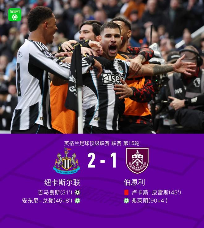 北京时间12月6日,英超第15轮,纽卡斯尔联主场迎战伯恩利。上半场,吉马良斯直接角球破门。卢卡斯·皮雷斯放倒了埃安加并吃到红牌。乌戈·舒库手球送出,安东尼·戈登主罚点球。下半场拉姆塞手球破门,弗莱明点球破门重新锁定胜局。最终,纽卡斯尔主场2-1战胜伯恩利。主赛事第31分钟,吉马良斯角球直接攻门。纽卡斯尔1-0领先。在咪咕上独家观看英超联赛。第43分钟,皮雷放倒埃安加并被红牌罚下。伯恩利少踢了一名球员。第45分钟和第8分钟,乌戈·舒库手球,戈登点球得分。第90分钟,纽卡斯尔2-0领先,第4分钟,拉姆塞送点,弗莱明主罚点球破门,伯恩利1-2纽卡斯尔。第6分钟,福斯特尝试远射,球偏离了目标。第22分钟,吉马良斯远射,第28分钟杜布拉夫卡将球没收,运气不好!第31分钟,戈登左路射门击中立柱。吉马良斯的角球直接射入球门。纽卡斯尔1-0领先。第43分钟,皮雷放倒埃安加并被红牌罚下。伯恩利少踢了一名球员。第45分钟和第8分钟,乌戈·舒库手球,戈登点球破门。纽卡斯尔2-0领先。第73分钟,戈登直接远射,皮球击中横梁弹出。第83分钟,埃兰加内切远射,皮球偏出底线。第90、4分钟,拉姆齐送点,弗莱明主罚点球破门。伯恩利1-2纽卡斯尔 球队阵容技术统计【咪咕独家观看英超】